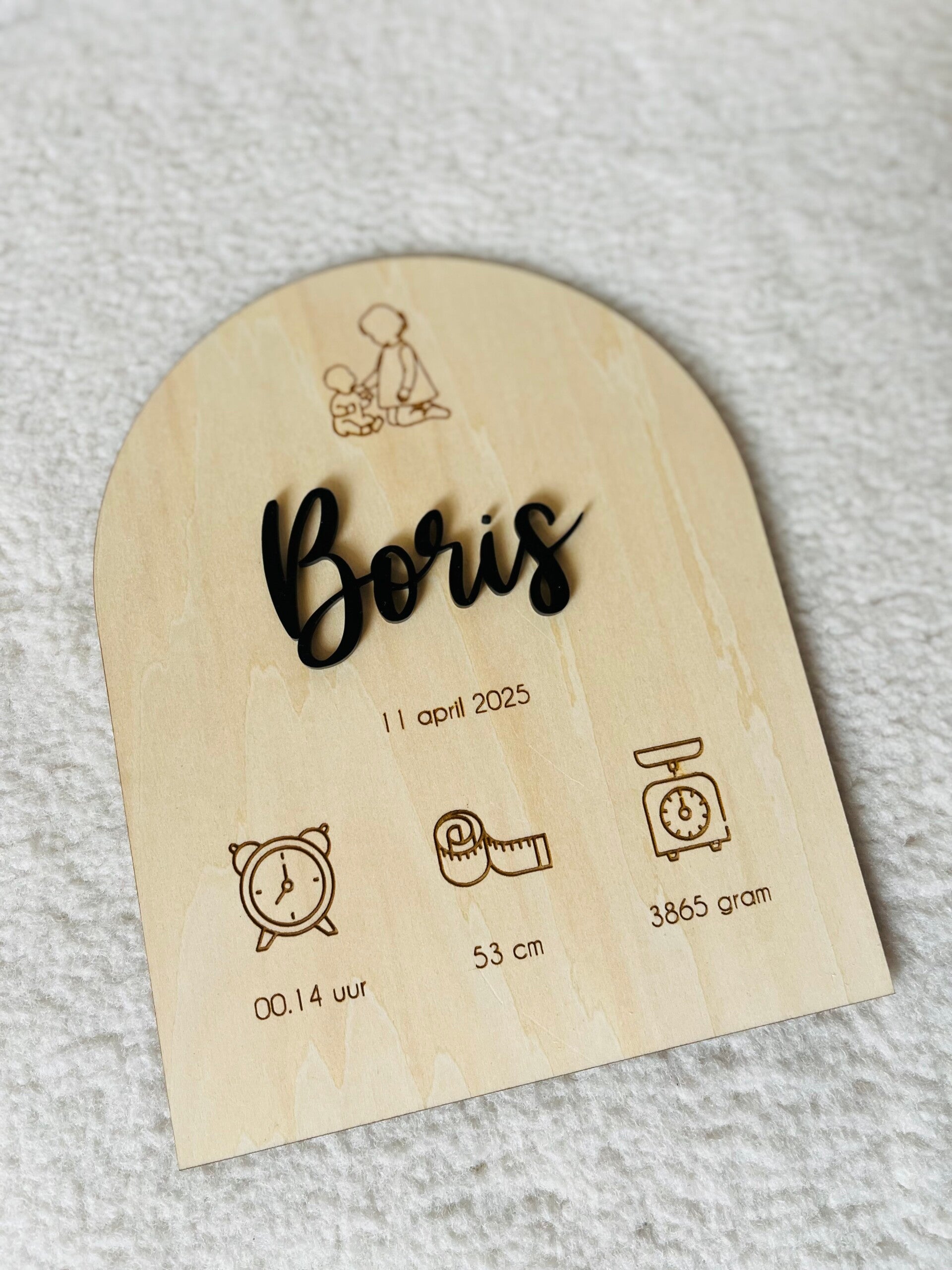 Op het bordje de naam en alle geboortegegevens van je kleintje. Wil jij iets anders? Laat het dan weten. Ook mogelijk met een gekleurde naam!