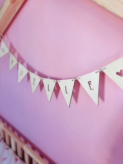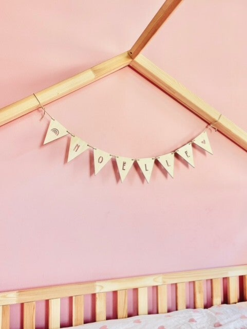 Hoe leuk is deze houten naamslinger. Een echte eyecatcher in de slaapkamer van jouw kleintje.